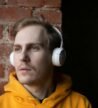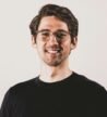 A person holds a professional video camera, pointing it directly at the viewer. The person has short, curly hair and wears a light brown jacket. The camera is positioned prominently in the center of the image, while the background is a plain, textured gray wall.